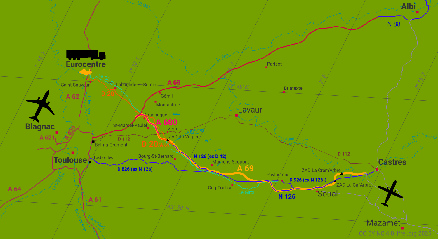 Toulouse's road network is characterized by the Toulouse ring road, formed by the junction of the A62 and A61 to the east, and the A620 to the west, from where the A621 connects to Blagnac airport. In the east, two major historic roads already link Castres to Toulouse: the D112 connects Castres to Toulouse via Lavaur, and further south, the N126 connects Castres to Toulouse via Puylaurens. The A68 links Albi to Toulouse, and the A680 runs along the Girou valley from the A68 at Gragnague to the Verfeil interchange with the D112. The A69 plans to extend the A680 through the Girou valley to Puylaurens, then on to Castres. The A69 would thus follow the historic N126 between Castres and Maurens-Scopont, the western part of the N126 having been downgraded to D826 between Maurens-Scopont and Toulouse, while at the same time the D42 up the Girou valley from Maurens-Scopont towards the Verfeil interchange has been integrated into the N126. Whereas the historic N126 offered a direct route between Castres and Toulouse, the modified N126 deviates northwards along the Girou, joining the A680 and then the A68, which descends southwards to reach the north of Toulouse.