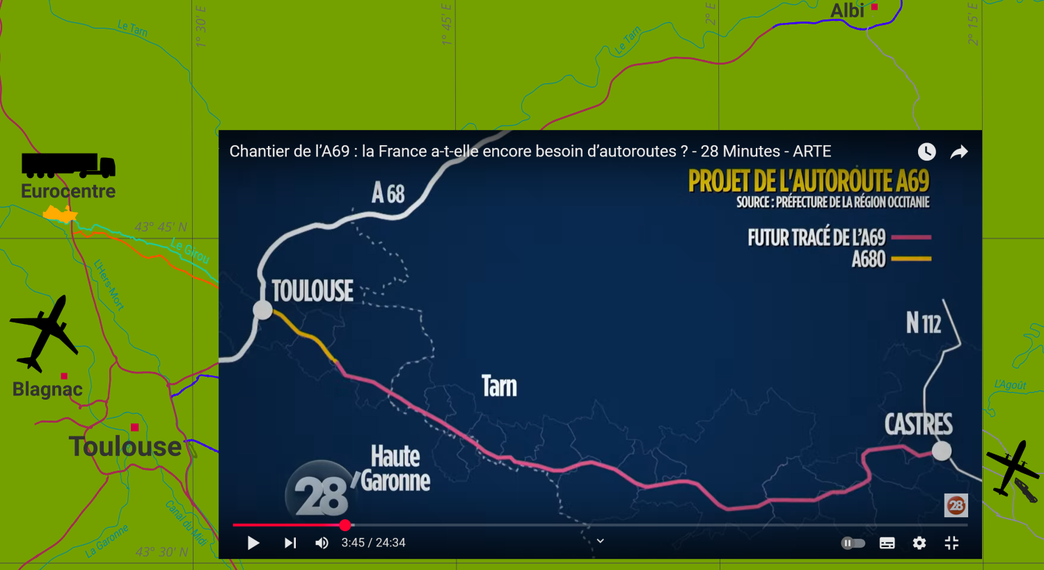 This route has been misleadingly described, notably in an Arte45 documentary featuring a map (Figure 4) apparently supplied by the Occitanie region prefecture, which masks the detour imposed by the A69 route by placing Toulouse in the place of the Gragnague half-diffuser on the A68, thus presenting the A69 route between Castres and Toulouse as direct. Beyond this misinformation, whose intentional or accidental nature remains to be assessed, more generally, many maps circulated in the media, or by Pierre Fabre's astroturfing46, show only the A69 route, or do not show the historic N12647, which does not allow the public to perceive the detour imposed by the A69, whereas it is hardly compatible with the argument of seeking to save time.
